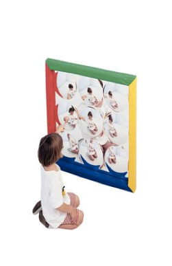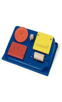 Este implemento ofrece cinco juegos para la estimulación somatosensorial: una placa redonda de color naranja que tiene un anillo circular interno que ilumina con una brillante luz de color rojo cuando se activa, una bola redonda de madera que se convierte en caja de música al tocarla, una placa de color amarrillo brillante con barra horizontal en relieve, una placa roja de gran tamaño con cinco protuberancias que vibra cuando se toca, y un rodillo de madera que suena un timbre al tocarse. Funciona con dos baterías tipo C ( no incluidas ).