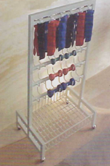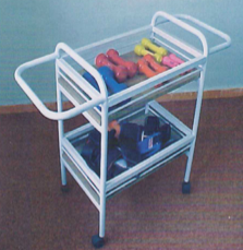 Fabricado en metal con PTR y acabado en pintura electrostática horneada. Con ganchos portapolainas y mancuernas. Con parrilla para varios artículos y ruedas con freno.