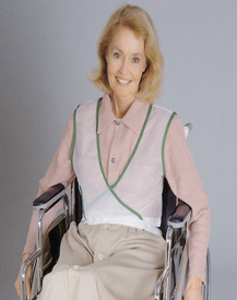 Chaleco de silla de ruedas para el control de posicionamiento está diseñado para ir y salir fácilmente. Las correas se sujetan detrás de la silla, fuera del alcance del residente. Las fijaciones están codificadas por colores para un tamaño y ajuste adecuados. Elección de dos telas duraderas lavables.