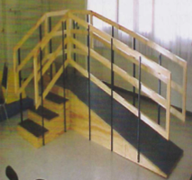 Fabricada en dos secciones de madera. Con hule antiderrapante y pasamanos de madera con fijación metálica.