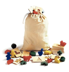Veinte diferentes figuras de madera y moldes texturizados vienen en una bolsa de tela duradera. Simplemente reparta los moldes y deje que los niños coloquen la figura sobre cada molde.