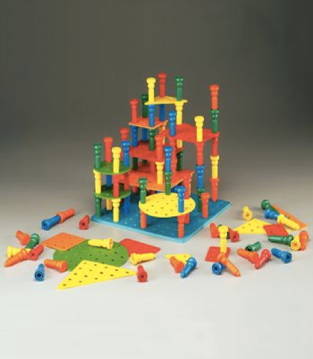 Este conjunto de apilamiento tridimensional enseña a los niños a como poner la clavija plástica para construir la próxima plataforma, así como a familiarizarse con las figuras, tamaños y colores. Incluye: • 100 clavijas plásticas de 6.67 cm aprox. • 1 cuadrado largo de 29.21 cm de 100 hoyos de goma crepé con base de lámina de cartón. • 17 figuras de goma crepé de colores y tamaños.