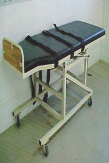 Fabricada en metal con PTR en calibre 16, acabado en pintura electrostática horneada. Acojinada con hule de espuma. Forrado en vinil. Sistema de cremallera para efectuar movimiento de inclinación de 0 º a 90 º. Con cinturones de seguridad torácico, pélvico y de rodilla. Con soporte de pie y ruedas y freno.
