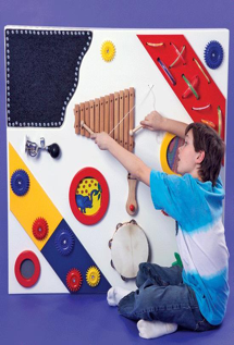Conjunto de elementos llamativos variables sonoros y de textura lleno de actividades que estimulan el sentido del tacto y oído. Colocados sobre un triplay acabado en laca blanca perfectamente sellado. Medidas: 1.15 x 1.15 mts y un espesor de 12mm.