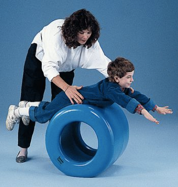 Moviéndolo suavemente, el terapista puede producir una experiencia de movimiento rítmico para el niño. Diámetro de 30.48 cm por dentro. Diámetro por fuera de 55.88 cm. Capacidad de peso de 113 kg. Libre de látex.